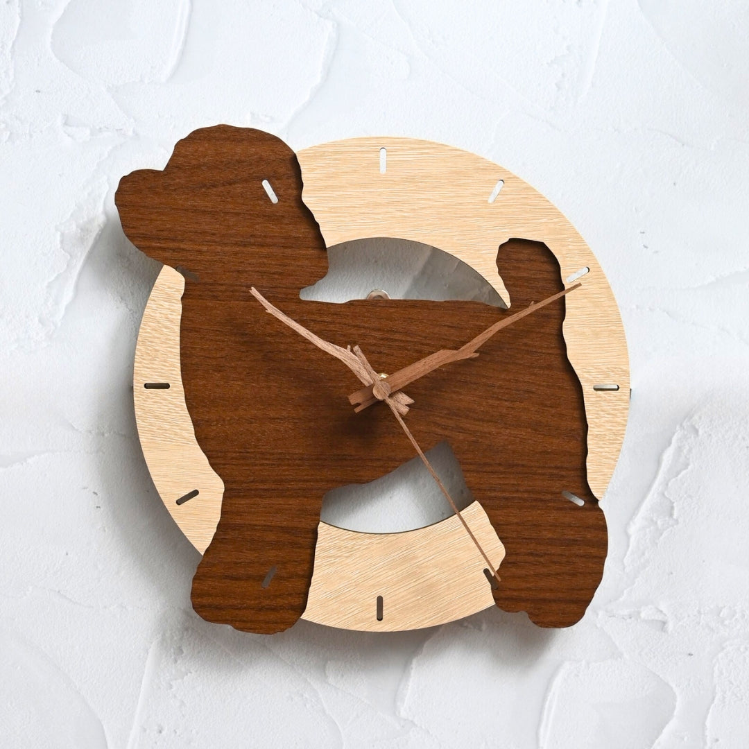 かわいいわんこが時計からとびだした、木目調の壁掛け時計です。