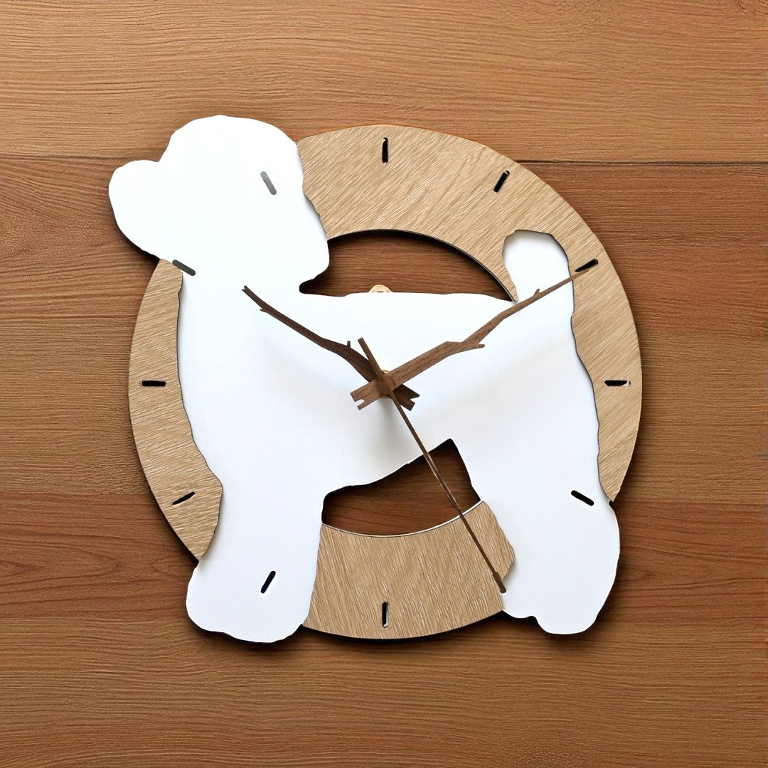 かわいいわんこが時計からとびだした、木目調の壁掛け時計です。
