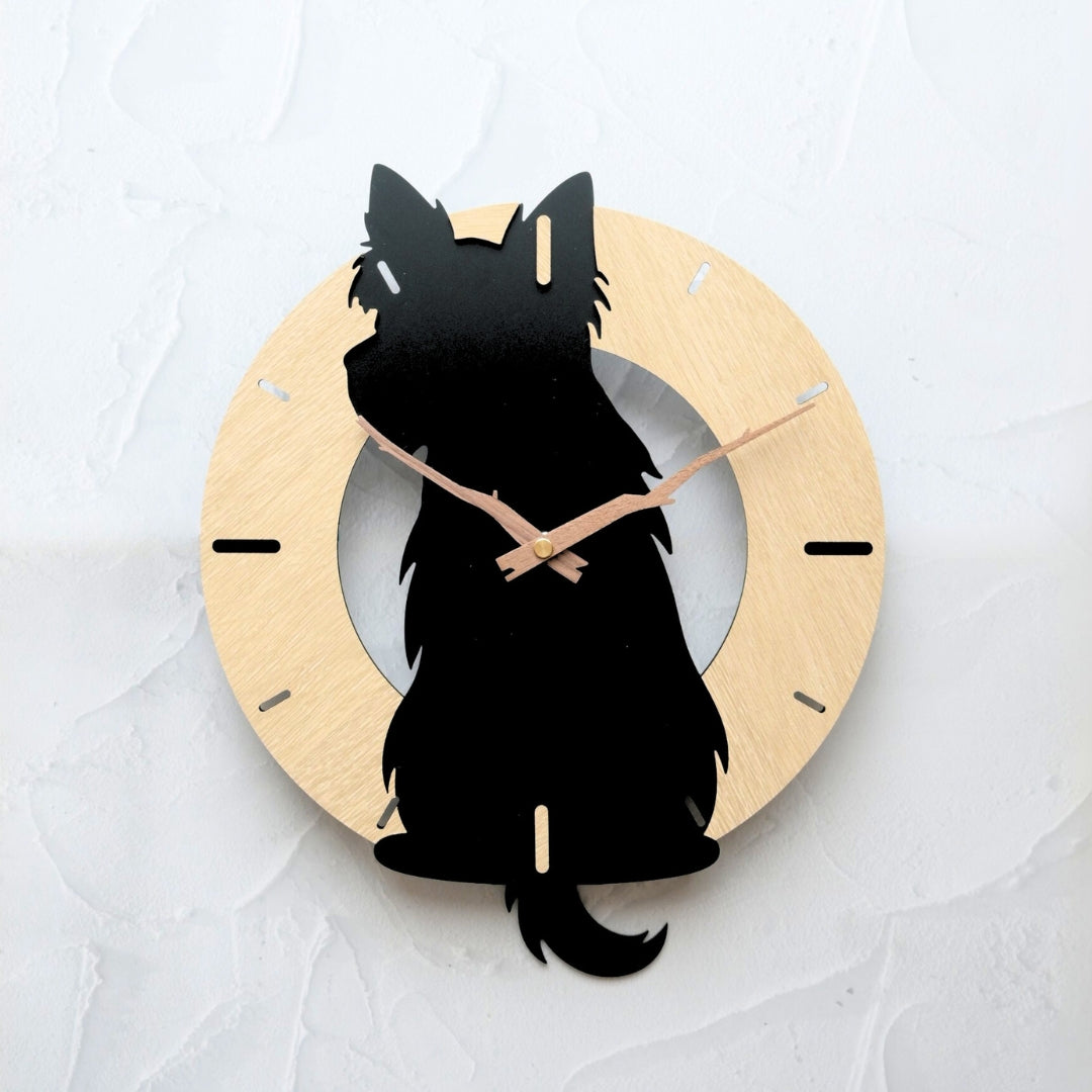 ウエスティをリクエストして、作っていただきました。最初にご提示いただいたデザイン案の一つに少し修正を加えてもらったところ、呼ばれた方を見て少し首を傾げて待っているうちの子によく似て、より可愛くなったのでそのデザインでオーダーしました。実物が来てみると、思ったより軽い素材で出来ており、始めはそのせいで安物に見えたりしないかな?と心配しましたが、壁に掛けてみると、部屋の雰囲気がとても良くなり、何より軽いので扱いが楽でした。振り子が動くようになると、何かを期待して尻尾を振って待っているようで、ますます可愛くなりました。チクタク音がないのもとても良いと思って眺めております。