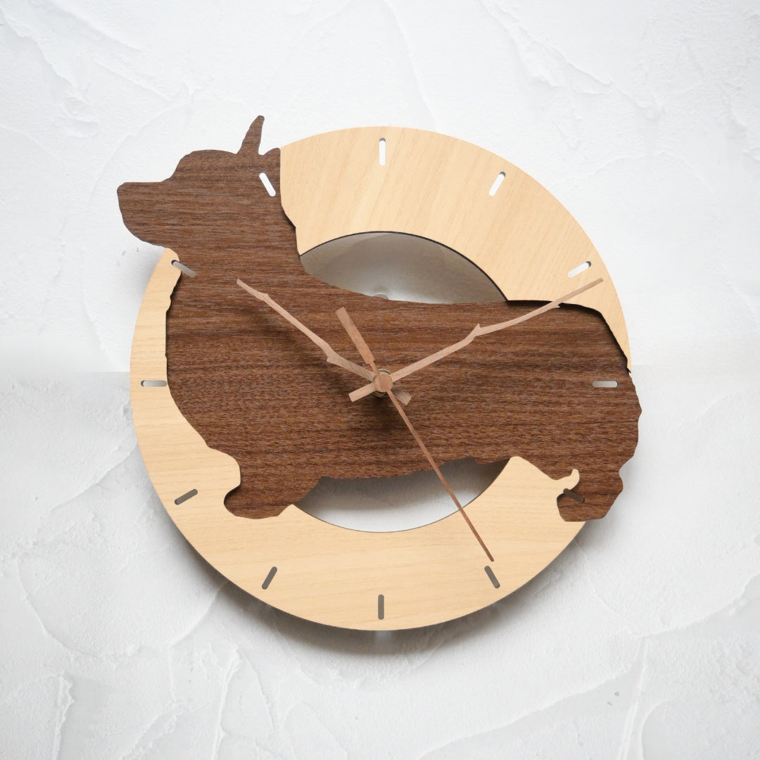 ウエスティをリクエストして、作っていただきました。最初にご提示いただいたデザイン案の一つに少し修正を加えてもらったところ、呼ばれた方を見て少し首を傾げて待っているうちの子によく似て、より可愛くなったのでそのデザインでオーダーしました。実物が来てみると、思ったより軽い素材で出来ており、始めはそのせいで安物に見えたりしないかな?と心配しましたが、壁に掛けてみると、部屋の雰囲気がとても良くなり、何より軽いので扱いが楽でした。振り子が動くようになると、何かを期待して尻尾を振って待っているようで、ますます可愛くなりました。チクタク音がないのもとても良いと思って眺めております。