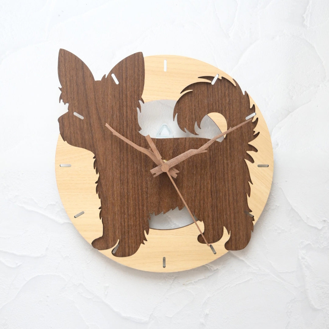 ウエスティをリクエストして、作っていただきました。最初にご提示いただいたデザイン案の一つに少し修正を加えてもらったところ、呼ばれた方を見て少し首を傾げて待っているうちの子によく似て、より可愛くなったのでそのデザインでオーダーしました。実物が来てみると、思ったより軽い素材で出来ており、始めはそのせいで安物に見えたりしないかな?と心配しましたが、壁に掛けてみると、部屋の雰囲気がとても良くなり、何より軽いので扱いが楽でした。振り子が動くようになると、何かを期待して尻尾を振って待っているようで、ますます可愛くなりました。チクタク音がないのもとても良いと思って眺めております。