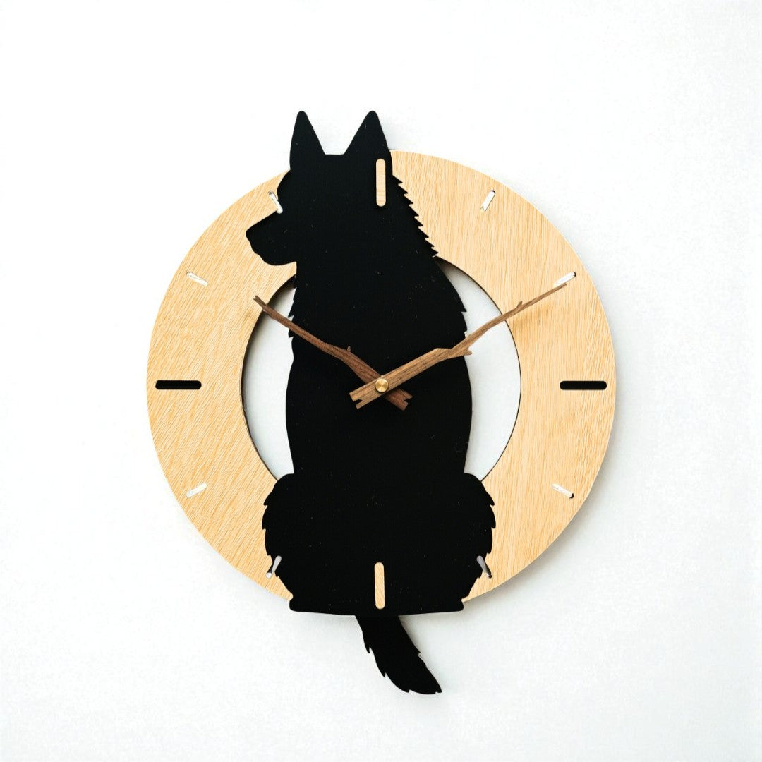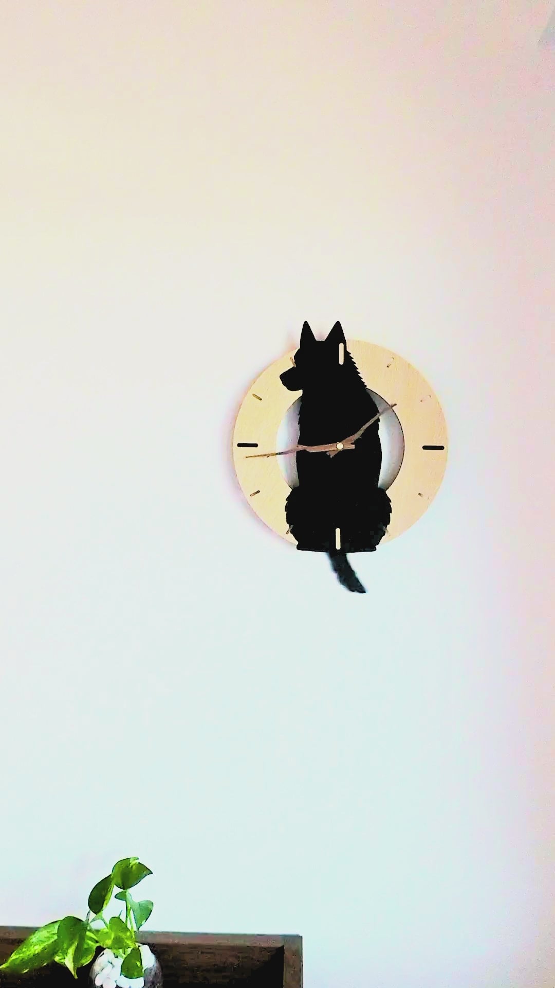 ウエスティをリクエストして、作っていただきました。最初にご提示いただいたデザイン案の一つに少し修正を加えてもらったところ、呼ばれた方を見て少し首を傾げて待っているうちの子によく似て、より可愛くなったのでそのデザインでオーダーしました。実物が来てみると、思ったより軽い素材で出来ており、始めはそのせいで安物に見えたりしないかな?と心配しましたが、壁に掛けてみると、部屋の雰囲気がとても良くなり、何より軽いので扱いが楽でした。振り子が動くようになると、何かを期待して尻尾を振って待っているようで、ますます可愛くなりました。チクタク音がないのもとても良いと思って眺めております。