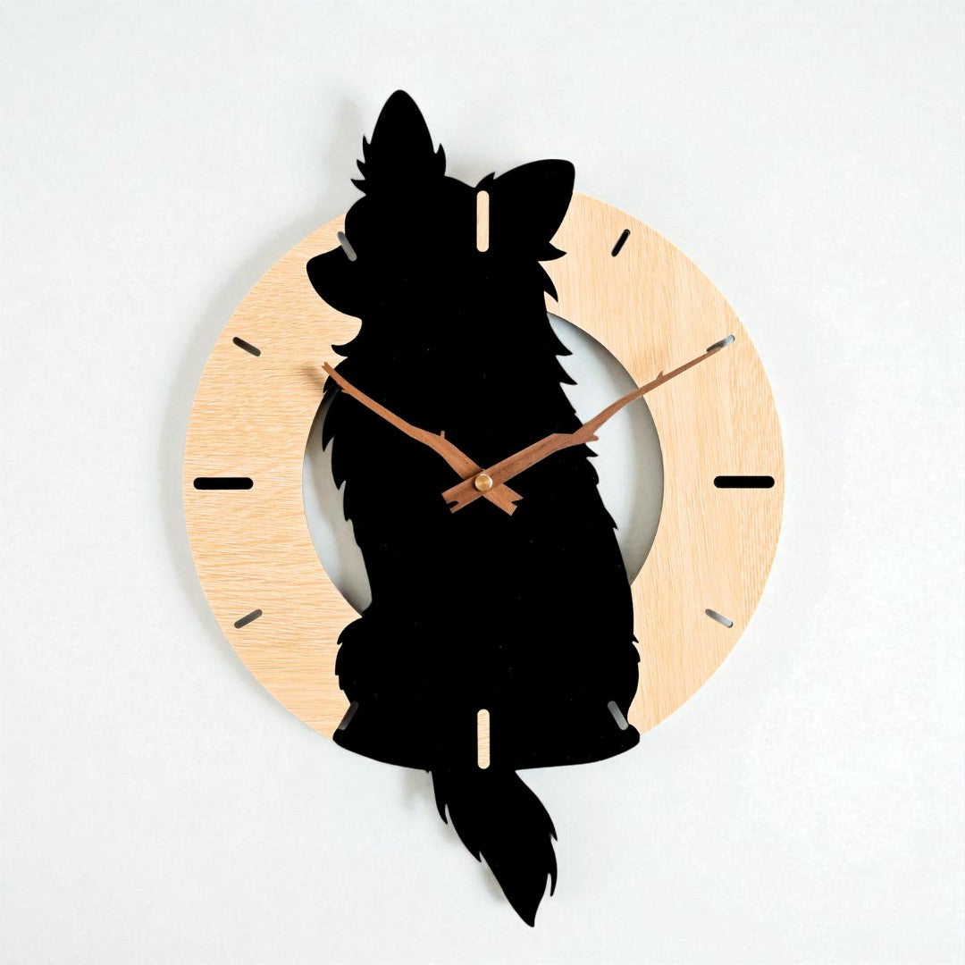 ウエスティをリクエストして、作っていただきました。最初にご提示いただいたデザイン案の一つに少し修正を加えてもらったところ、呼ばれた方を見て少し首を傾げて待っているうちの子によく似て、より可愛くなったのでそのデザインでオーダーしました。実物が来てみると、思ったより軽い素材で出来ており、始めはそのせいで安物に見えたりしないかな?と心配しましたが、壁に掛けてみると、部屋の雰囲気がとても良くなり、何より軽いので扱いが楽でした。振り子が動くようになると、何かを期待して尻尾を振って待っているようで、ますます可愛くなりました。チクタク音がないのもとても良いと思って眺めております。