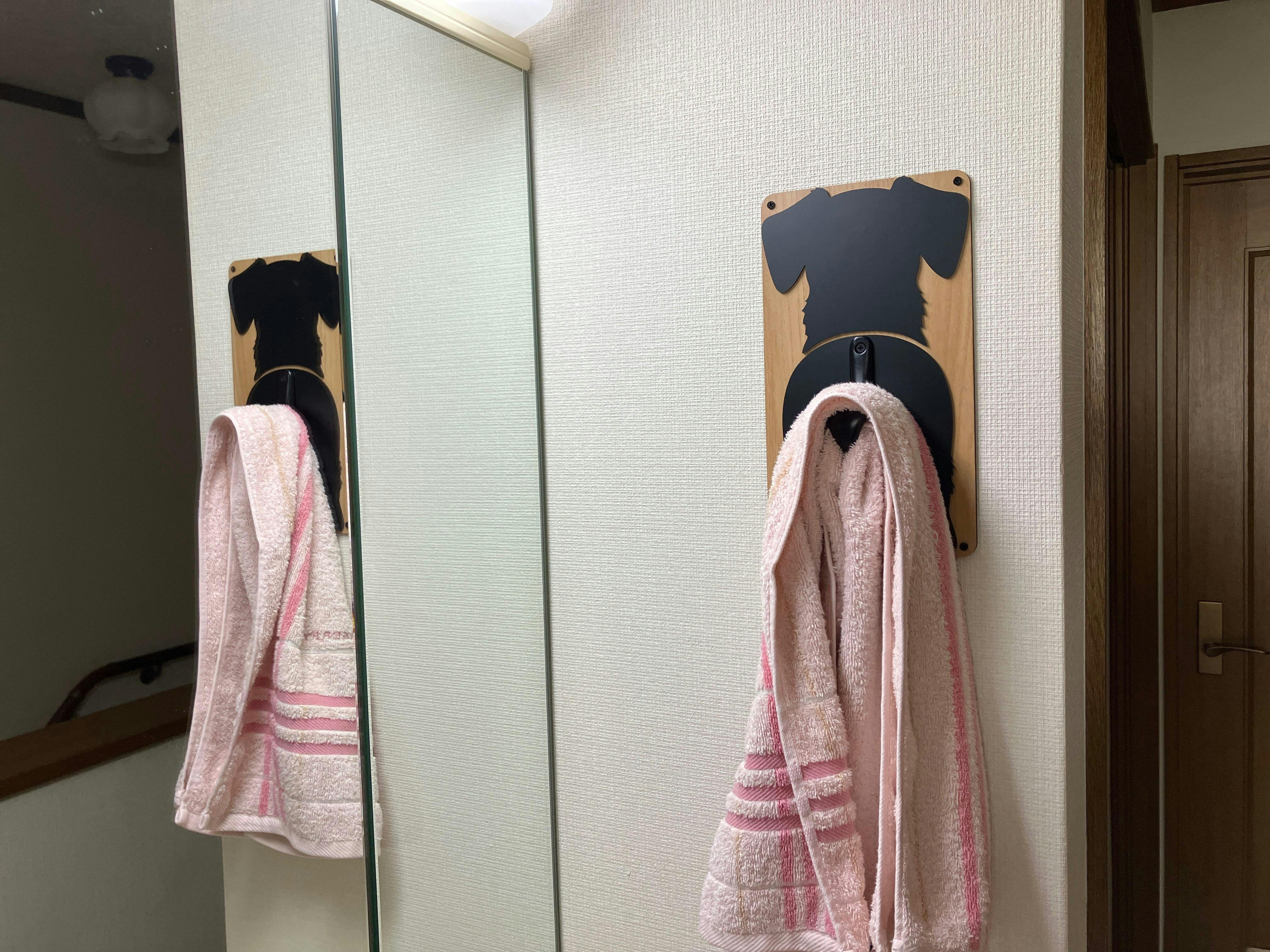 犬の後ろ姿が可愛い、壁付けタイプのタオルフックです。