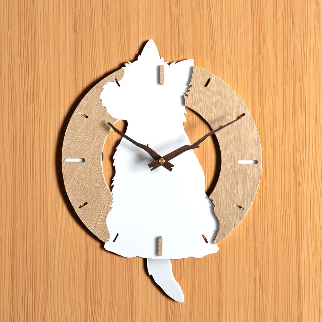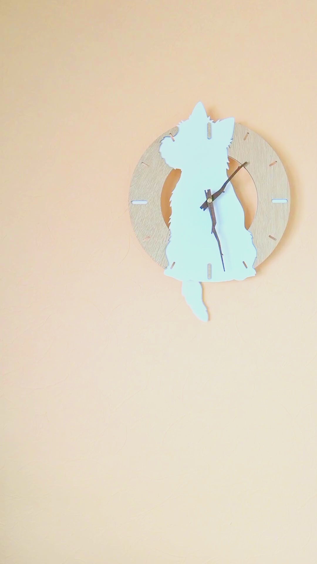 ウエスティをリクエストして、作っていただきました。最初にご提示いただいたデザイン案の一つに少し修正を加えてもらったところ、呼ばれた方を見て少し首を傾げて待っているうちの子によく似て、より可愛くなったのでそのデザインでオーダーしました。実物が来てみると、思ったより軽い素材で出来ており、始めはそのせいで安物に見えたりしないかな?と心配しましたが、壁に掛けてみると、部屋の雰囲気がとても良くなり、何より軽いので扱いが楽でした。振り子が動くようになると、何かを期待して尻尾を振って待っているようで、ますます可愛くなりました。チクタク音がないのもとても良いと思って眺めております。