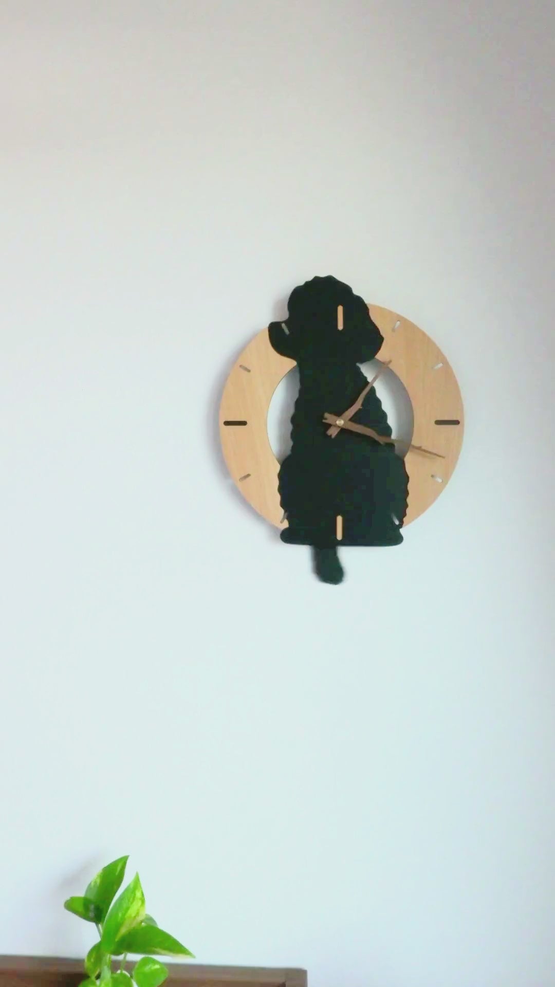 ウエスティをリクエストして、作っていただきました。最初にご提示いただいたデザイン案の一つに少し修正を加えてもらったところ、呼ばれた方を見て少し首を傾げて待っているうちの子によく似て、より可愛くなったのでそのデザインでオーダーしました。実物が来てみると、思ったより軽い素材で出来ており、始めはそのせいで安物に見えたりしないかな?と心配しましたが、壁に掛けてみると、部屋の雰囲気がとても良くなり、何より軽いので扱いが楽でした。振り子が動くようになると、何かを期待して尻尾を振って待っているようで、ますます可愛くなりました。チクタク音がないのもとても良いと思って眺めております。